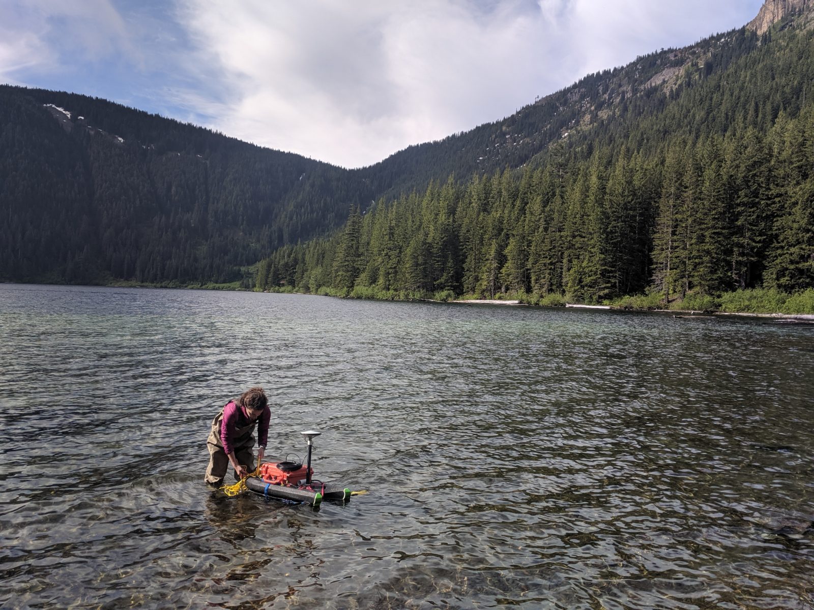 LOCSS team member Megan Rodgers prepares a GPS drifter to measure the elevation of Walupt Lake in Gifford Pinchot National Forest, Lewis County, Washington.