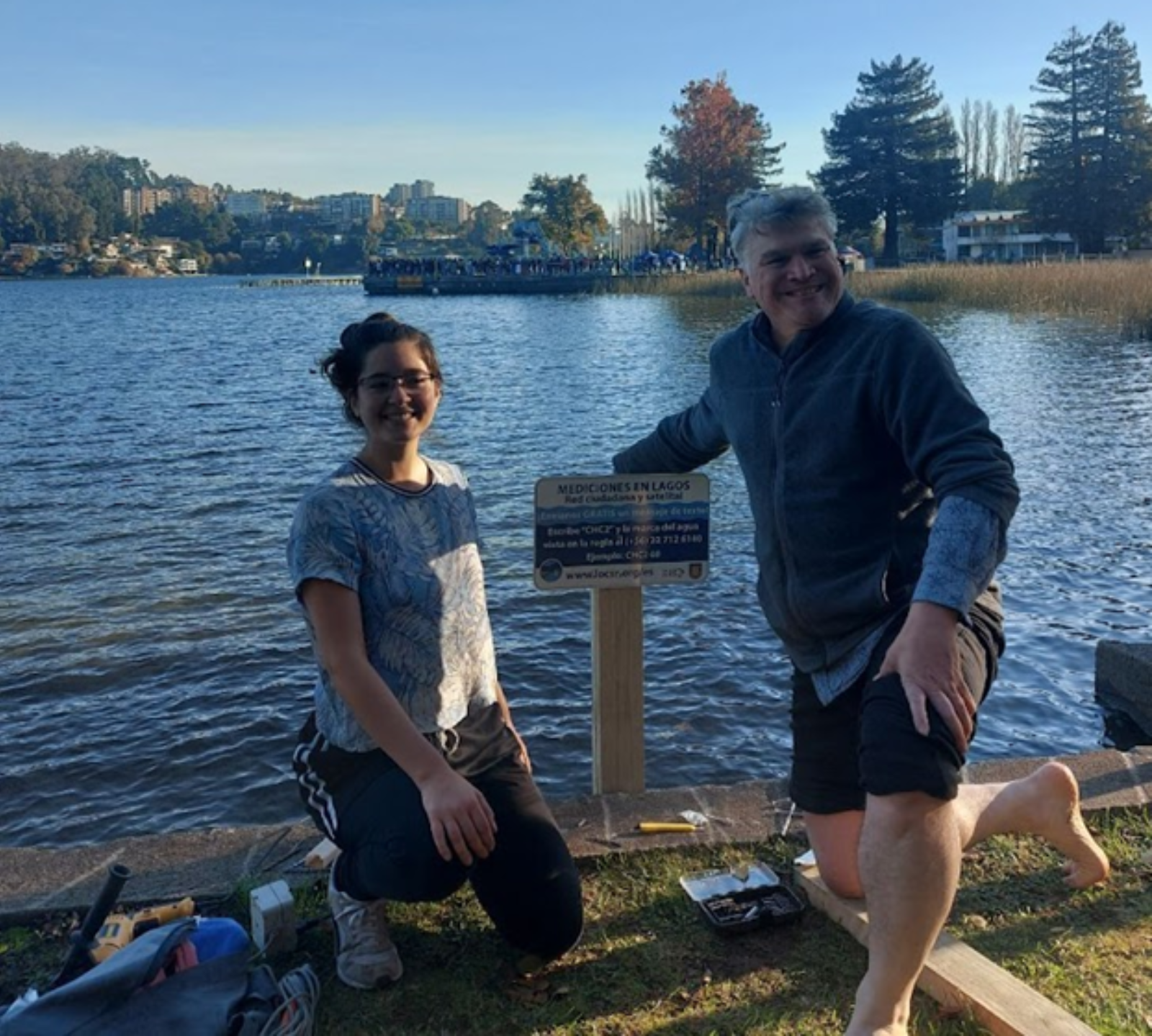 Instalando un nuevo limnímetro en Laguna Chica, Concepción Chile con colaboradores de la Universidad de Concepción y de la zona